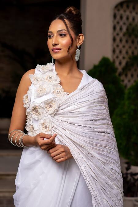Appliqued flowers on the shoulder, Attached inner lining for comfort, Intricate bead and sequin work on the drape