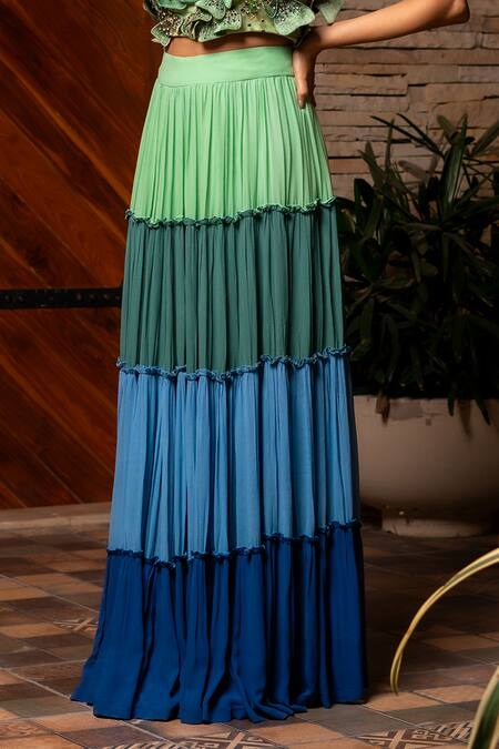 Multi Color Silk, Net, Georgette Embroidery Open Neck Ruched Skirt And Bustier Set