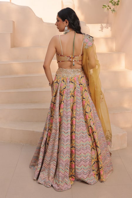 Yellow lehenga featuring botanical and geometric prints with sequin, gota, and bead hand embellishments. Paired with a floral padded blouse and an embellished dupatta.