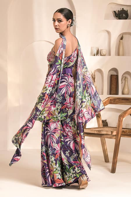 Purple Crepe Embroidery One Shoulder Floral Embellished Tunic Sharara Set