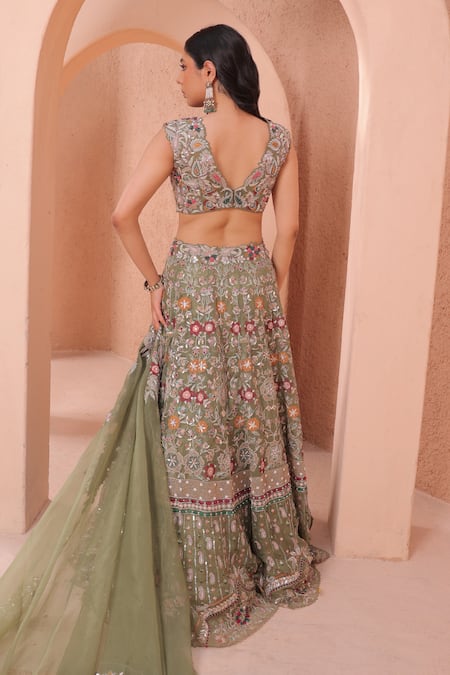 Olive green lehenga featuring hand embellishments with blossom and paisley designs. Paired with a padded blouse and a dupatta with cutwork details.