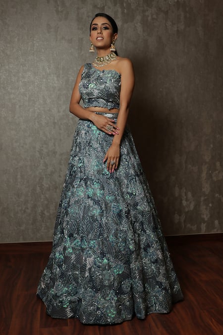 Cyan blue lehenga featuring floral hand embroidery with metallic dori work. Paired with a coordinating one shoulder padded blouse.