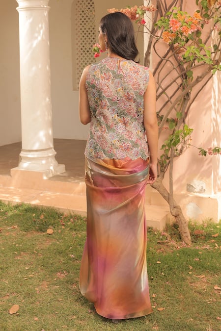 Multi color top featuring mixed embroidery and padded design. Paired with a draped skirt with attached inner lining in organza fabric.