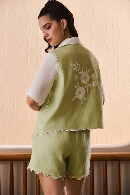 Green co-ord set featuring a vest, shirt, and shorts. The vest is adorned with floral embroidery and pom-pom detailing.