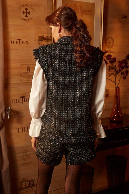 Black tweed sleeveless jacket with checkered pattern, collar, fringe trims, patch pockets & frayed hem. Paired with A-line shorts, crepe satin shirt with bishop frill sleeves & ruffle yoke.