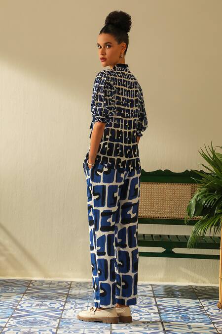 Blue geometric print shirt featuring puff sleeves and a tie-up collar. Paired with narrow fit printed pants with an elasticated waistband and side pockets.
