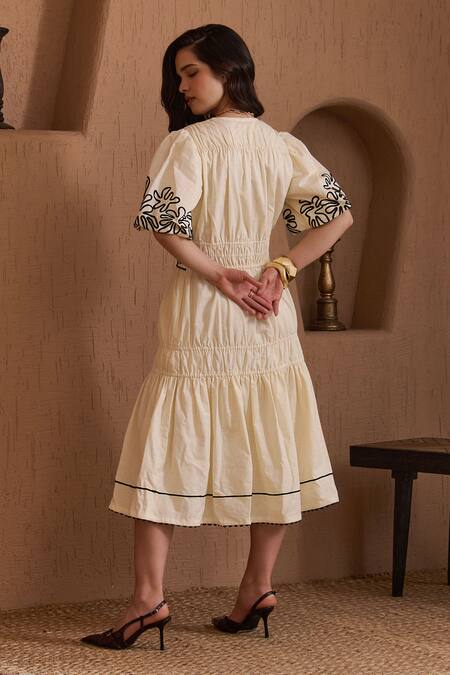 Beige dress featuring intricate black embroidery on the sleeves and waistband