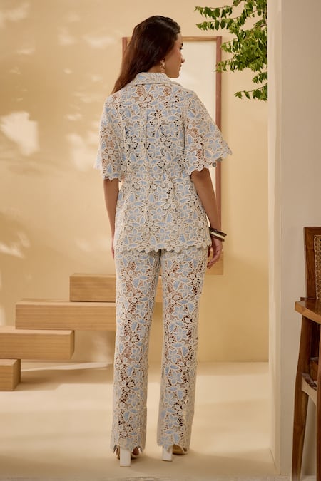 Blue Flannel Lace, Cut Work Collared Floral Mesh Cutout Shirt And Pant Set