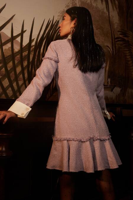 Purple Tweed, Lining Taffeta Collared Neck Iris Dress With Bowtie