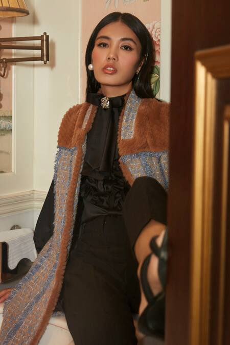 Brown tweed & faux fur gilet with multi panel patch work, fringe trim details & fur hem. Paired with black crepe satin shirt with ruffle yoke, collar, bishop sleeves & embellished bow-tie.