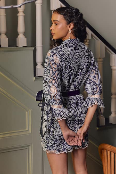 Denim blue playsuit featuring all-over floral cutwork embroidery and lace highlights. It comes with a matching belt and has scallop details on the sleeve opening and hem.