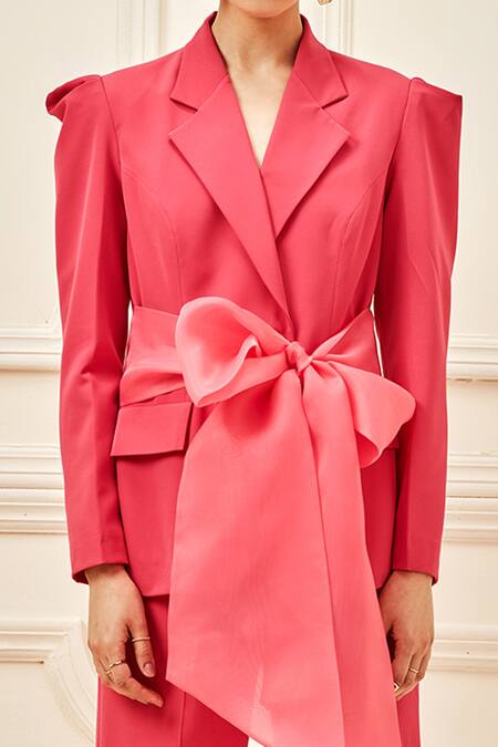 Hot pink blazer with knot tie-up detail. Paired with straight legged pant.