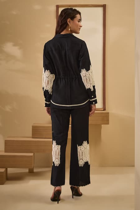 Black Cotton, Linen Lace Collared Sleeve Shirt And Pant Set