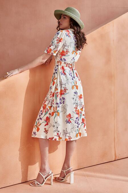 Red Buckles Collared Meraki Floral Print Midi Dress