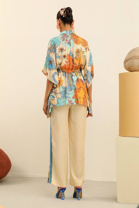 Blue kimono top featuring floral prints, shirt collar, and drawstring detail. Paired with high waist trousers in heavy luxury crepe with stripe detail at the side seam.