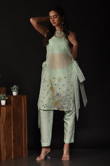 Mint green sheer kurta featuring dispersed floral embroidery and side tie-up detail. Paired with coordinating pant and a crop top.