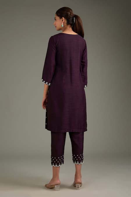 Wine Silk Embroidery, Metallic Thread V-neck Moti Kurta And Pant Set