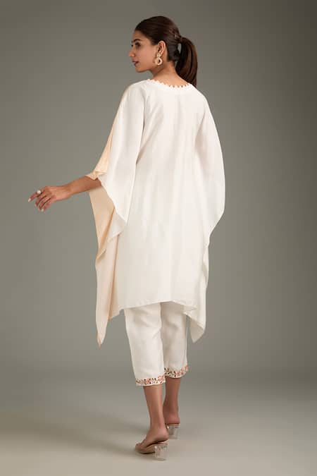 White color blocked kaftan featuring a round neckline with cutwork detail and batwing sleeves. Paired with embroidered hem cropped pant and a separate inner slip.