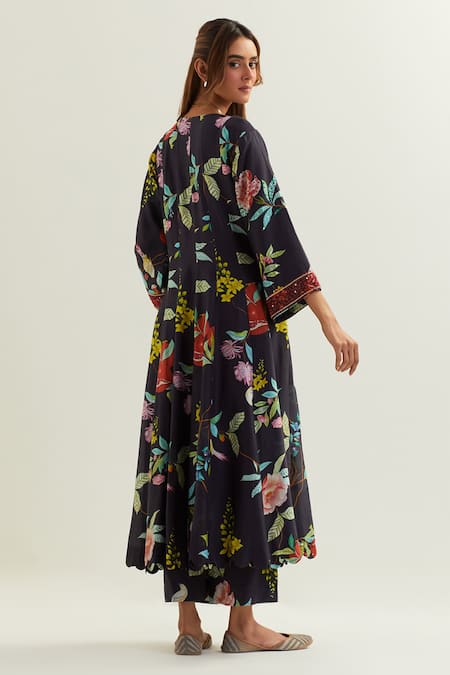 Black V neck Anarkali featuring three fourth flared sleeves with box pleats and an all over botanic florence print. Paired with a matching printed pant.
