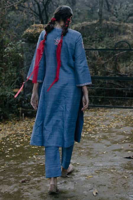 Earthy blue straight long kurta featuring pink-tone floral motif embroidery. Paired with matching pants, it has a keyhole neck, flared sleeves, and side slits.