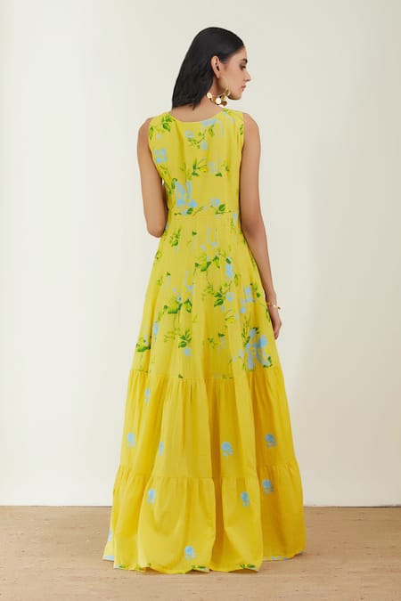 Yellow tiered maxi dress featuring contrast resham embroidery and floral prints