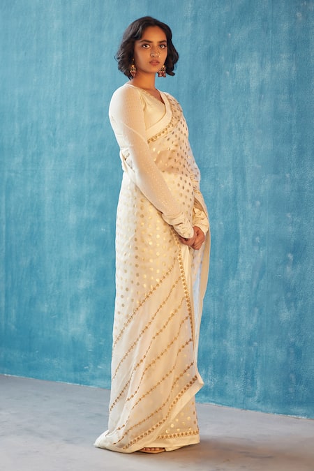 Ivory saree with all-over foil print and intricate zardozi embroidery at the border and pallu. Comes with pure chiniya silk blouse.
