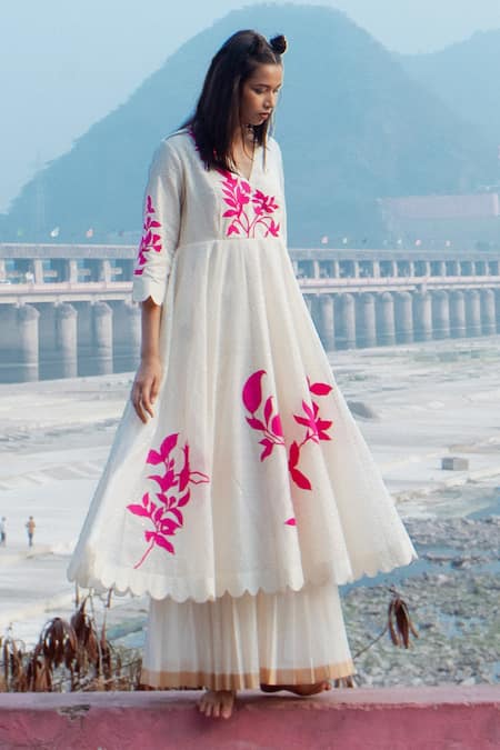 Ivory Anarkali featuring foil print and pink floral applique work. Paired with a pleated palazzo and scalloped cut work hem details.