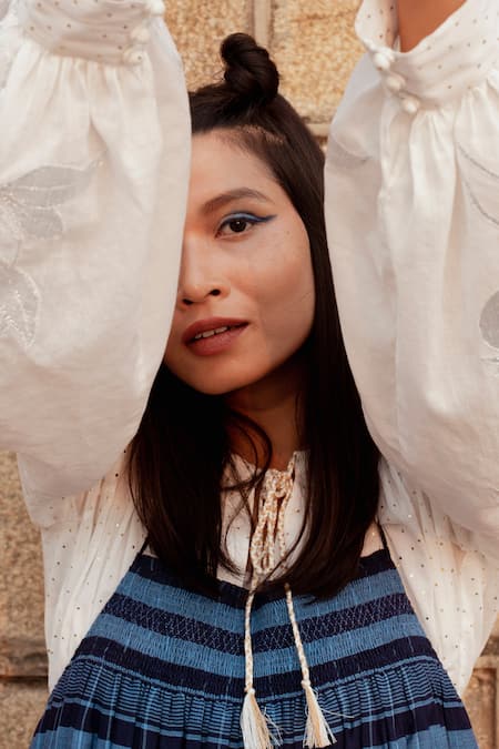 Navy blue handwoven pinafore dress featuring a square neckline and attached lining. Paired with a cotton mulmul shirt with a keyhole round neck, puff sleeves, and foil print with floral applique work.