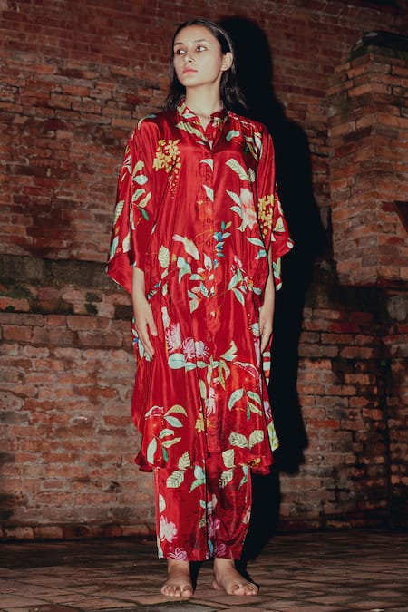 Maroon Habutai Silk Floral Motifs Laal Phool Printed Kimono Kurta And Pant Set
