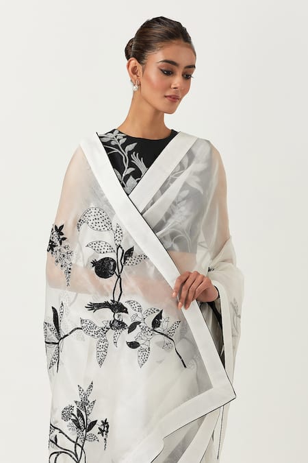 Ivory saree crafted in organza silk featuring intricate floral embroidery. Paired with a sleeveless padded blouse with a round neckline.