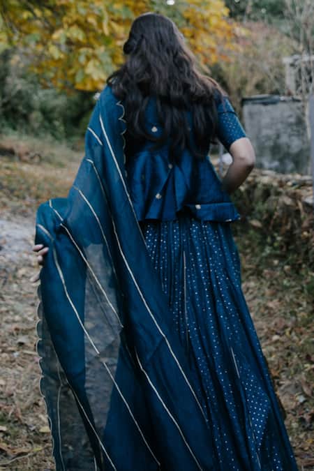 Midnight blue lehenga featuring a placement gota hem and a peplum blouse. Paired with a scallop border hand embroidered striped organza silk dupatta.