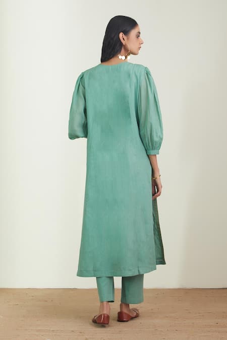 Mint green A-line kurta with printed checks yoke and resham embroidery. Paired with a straight legged pant.