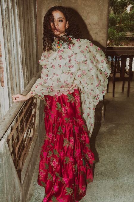 Maroon chanderi silk printed lehenga and blouse. Paired with ivory organza silk printed dupatta.