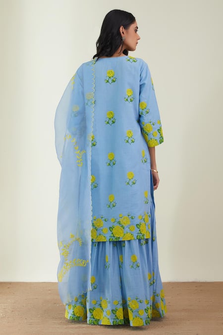 Powder blue printed sharara set with sequins highlight. Comes with organza silk resham embroidered dupatta.