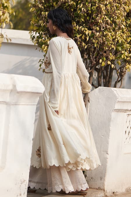 White chanderi silk gathered anarkali featuring a notched round neck and floral pattern with metallic zari & sequin embroidered yoke. Paired with a stripe pattern flared sharara and a scalloped floral embroidered dupatta.