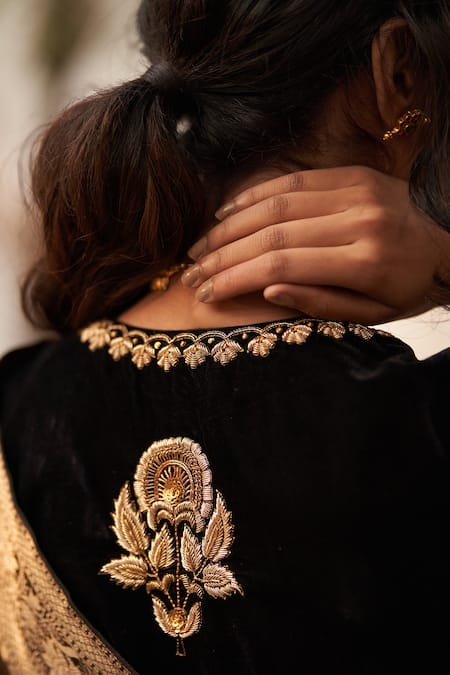 Black Velvet Zari V-neck Surma Rani Phool Embroidered Blouse