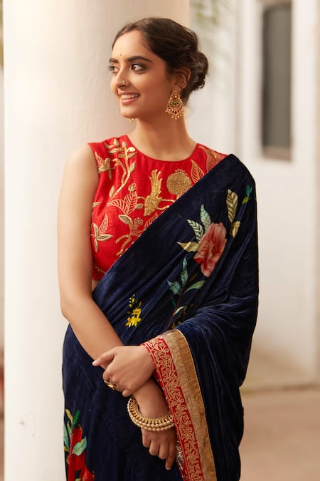 Blue silk velvet saree featuring an all-over multi-color floral print and contrast red zari & gota embroidered border. Paired with a red blouse showcasing a bird and floral pattern with metallic zardozi and sequin embroidery.