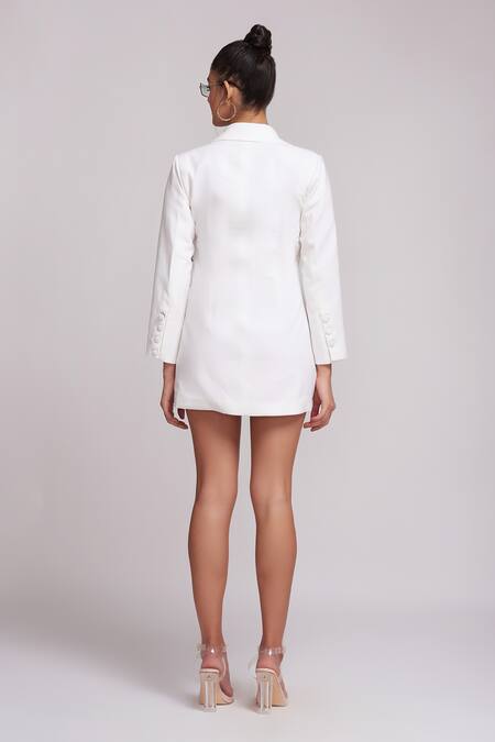 Label Frow_White Satin, Crepe Collared Diane Lapel Dress_Online_at_Aza_Fashions