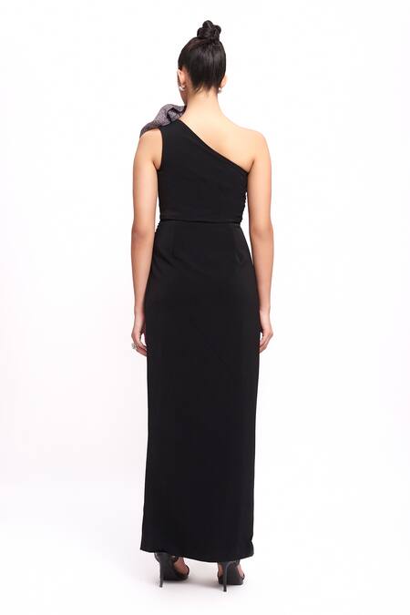 Buy_Label Frow_Black Crepe Fabric Flowers Asymmetric Elizabeth Embellished Gown_Online_at_Aza_Fashions