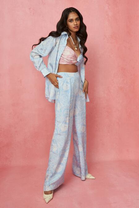 Shop_Label Frow_Blue Crepe Collared Floral Print Shirt Pant Set_Online_at_Aza_Fashions