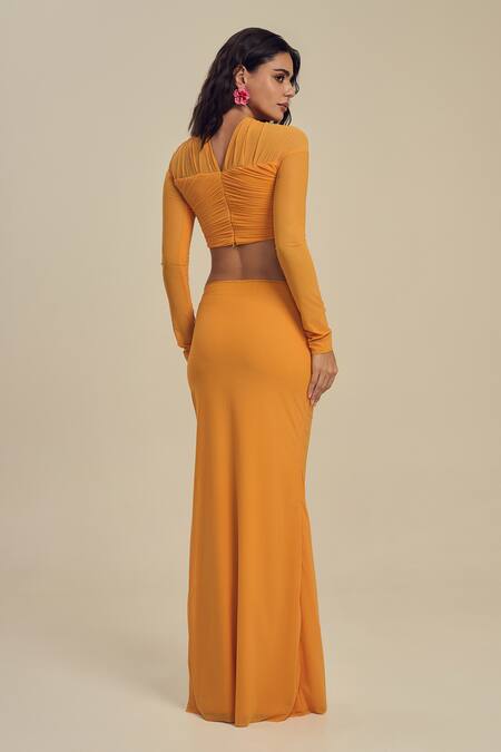 Orange floor-length maxi skirt set featuring a ruched V-front design. Includes a fitted crop top with long sleeves and an attached lining.
