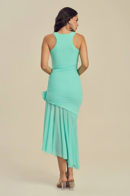 Buy_Label Frow_Green Lycra, Net Fabric Flowers Round Neck Joy Asymmetrical Dress_at_Aza_Fashions