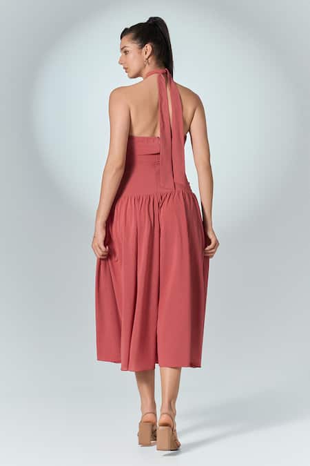 Buy_Label Frow_Pink Crepe Halter Neck Plum Criss-cross Midi Dress_Online_at_Aza_Fashions
