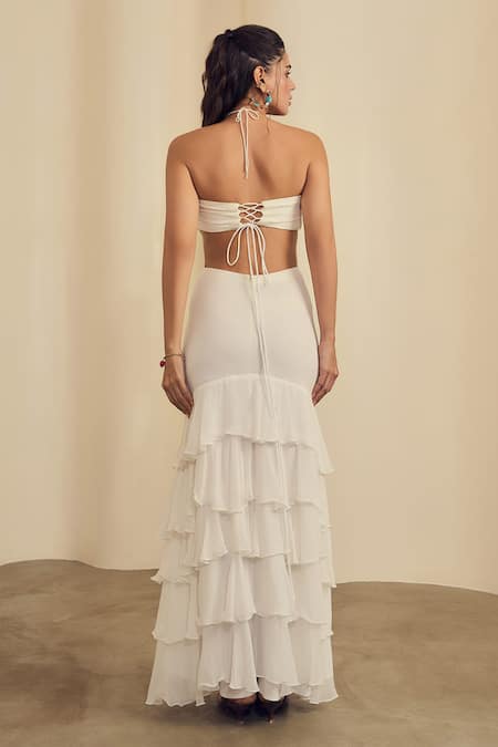 Ruched bust detail, Criss-cross lace-up back, Layered ruffle hem