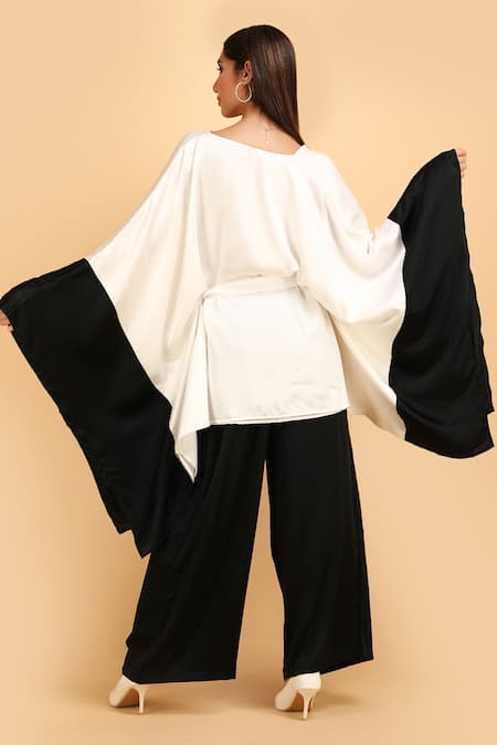 Shop_Label Ivish_Black Silk V-neck And White Kimono Jacket Trouser Set _Online_at_Aza_Fashions
