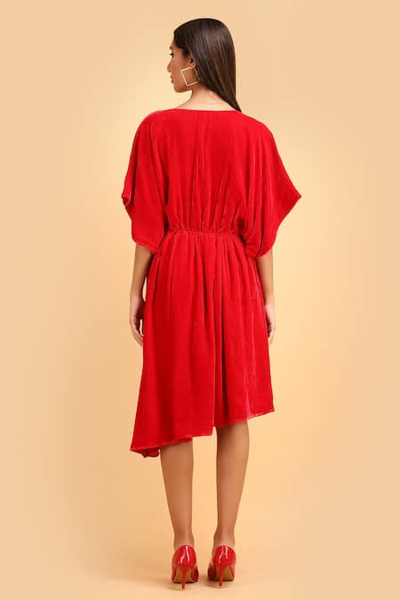 Buy_Label Ivish_Red Silk, Velvet V-neck Gathered Asymmetric Dress _Online_at_Aza_Fashions