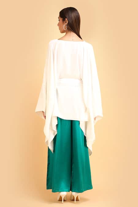 Buy_Label Ivish_White Silk Satin V-neck Kimono Jacket And Green Trouser Set _Online_at_Aza_Fashions
