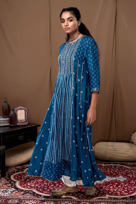 Blue anarkali in bandhani print with mirror & thread embroidery on the yoke. Paired with off-white cotton silk pant.