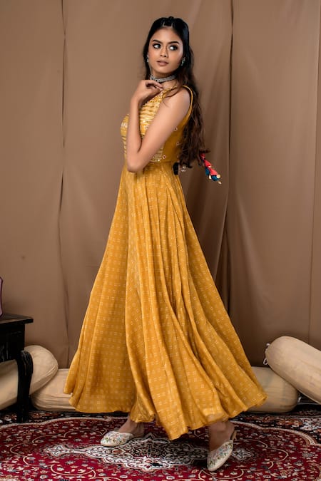 Mustard anarkali with bandhani prints, bias cut hem & heavy embroidery on the yoke & tassels at the back.