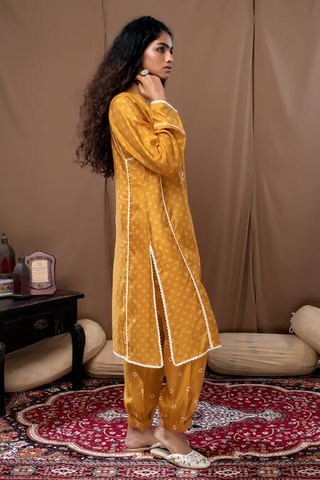 Mustard oversized short kurta with bandhani prints, detailed with crochet buttons. Paired with pleated salwar.